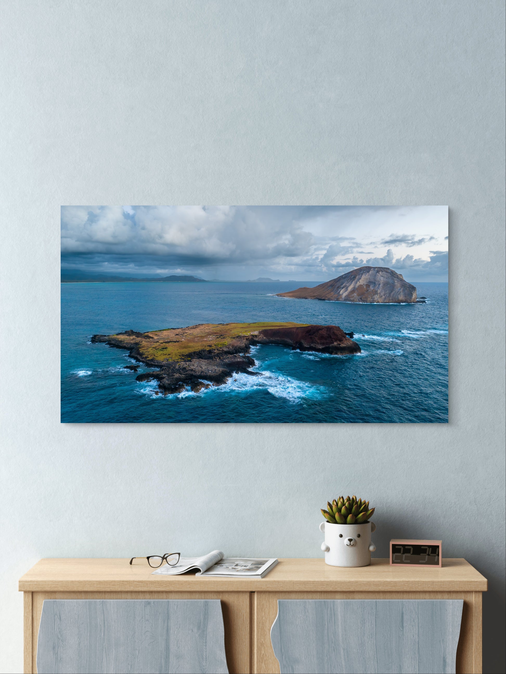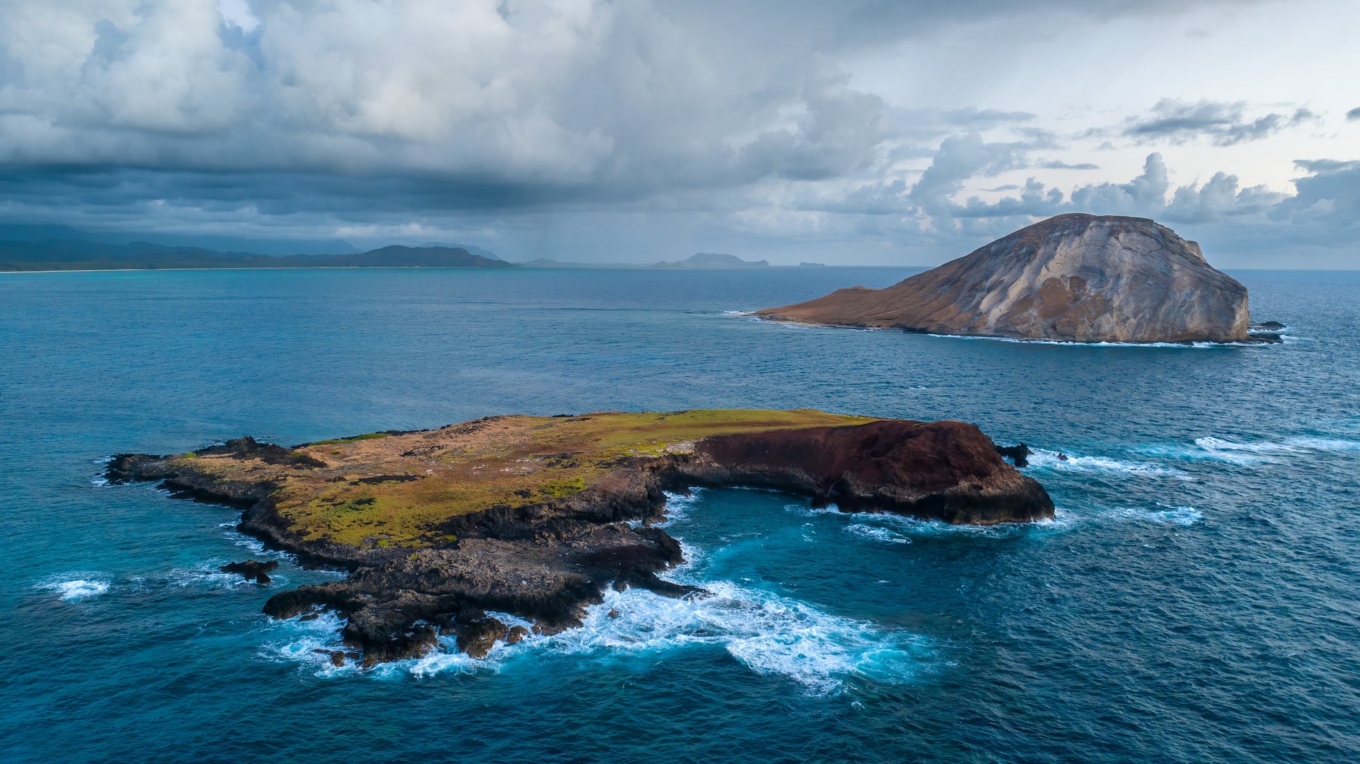 This aerial view captures the striking beauty of Mānana Island Seabird Sanctuary, a protected habitat off the coast of Oahu. The rugged cliffs and vibrant green plateau of the larger island contrast with the deep blue of the surrounding Pacific Ocean. The smaller landforms and distant coastline create a layered perspective, enhanced by dramatic clouds that evoke the untamed spirit of Hawaii’s landscapes.