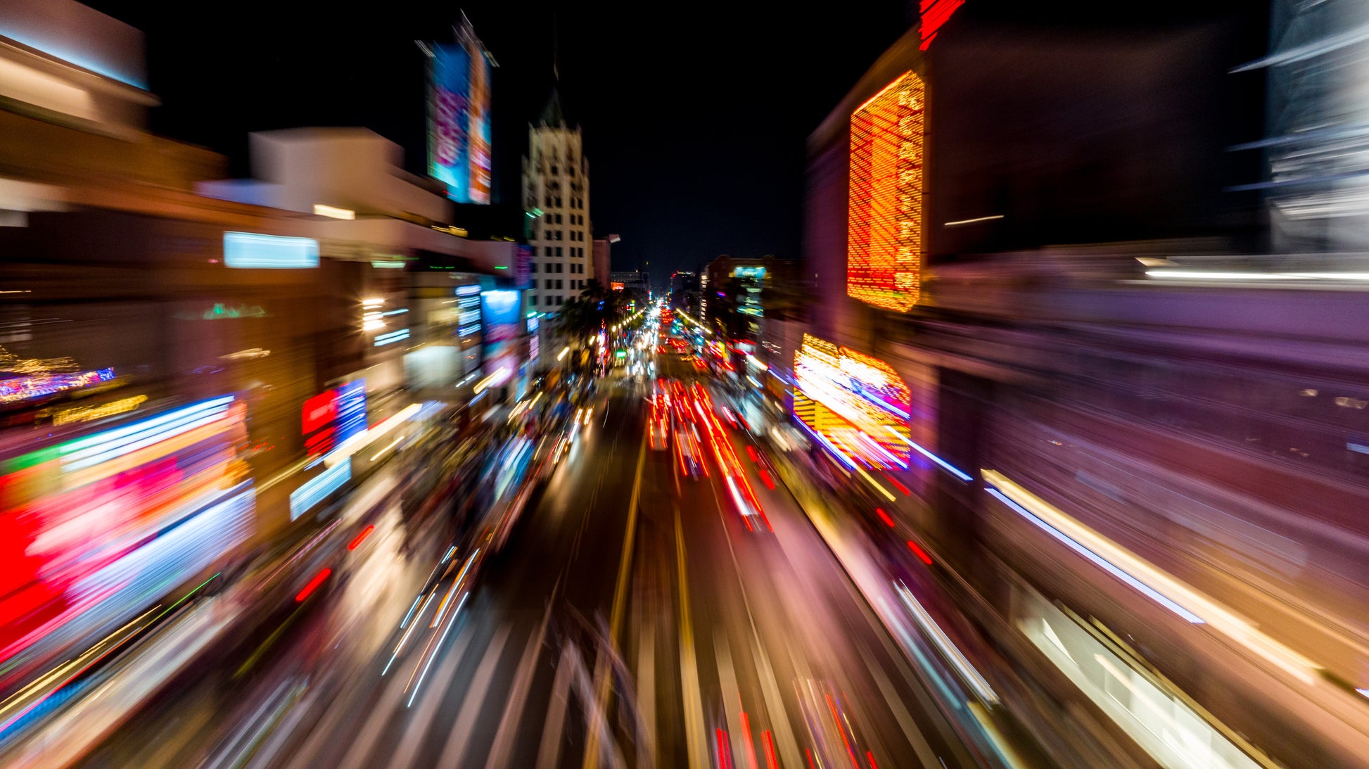 This energetic portrayal of Hollywood Boulevard captures the dynamic essence of city life. Blurred lights and streaking colors evoke a sense of constant movement, mirroring the city’s perpetual pulse. Neon reds, oranges, and blues streak across the image, transforming the iconic boulevard into an abstract symphony of urban life.