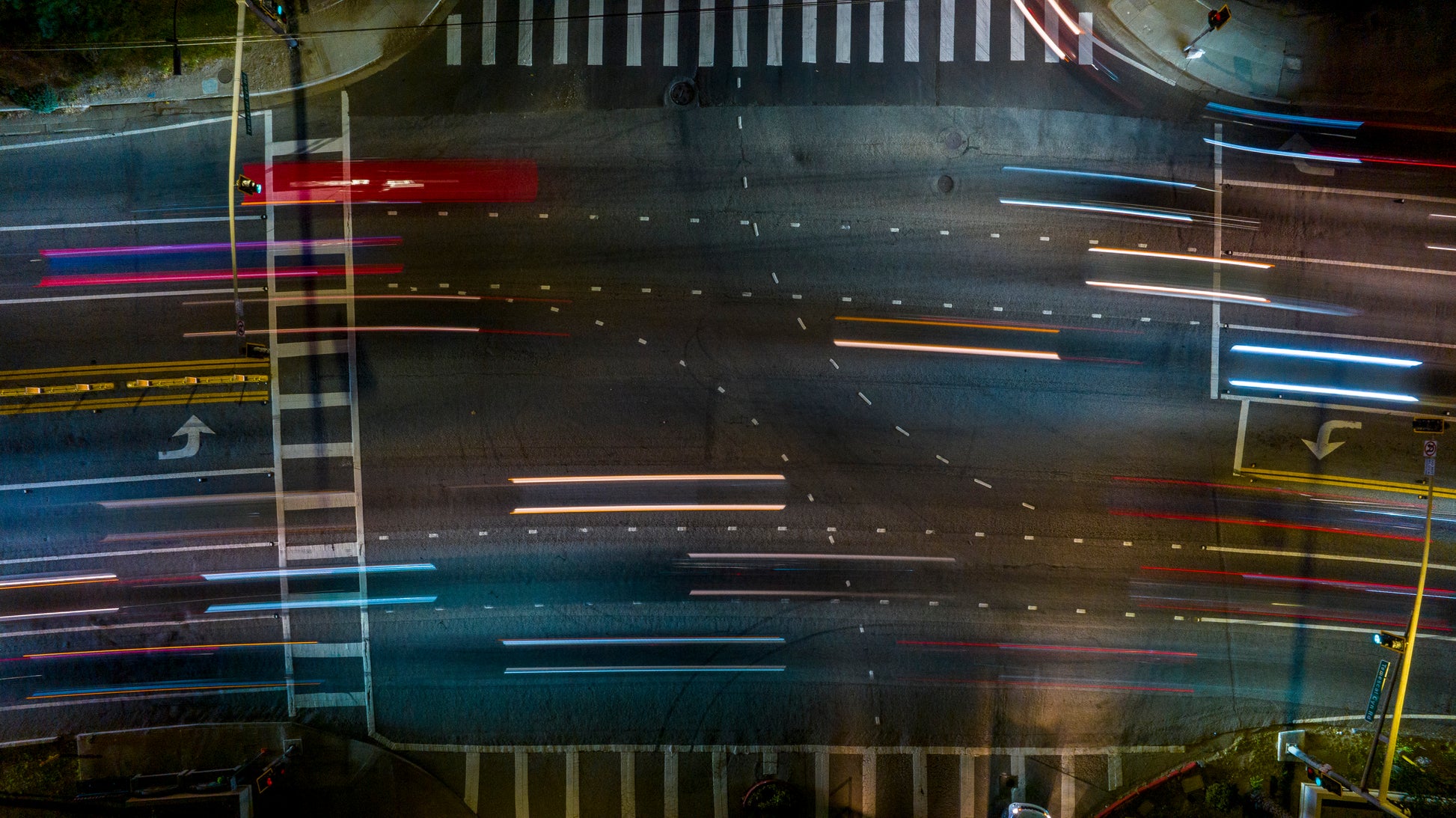 This striking aerial view captures the Pacific Coast Highway at an intersection in Pacific Palisades, where streaks of light from moving vehicles weave vibrant patterns against the darkened asphalt. The interplay of bright reds, whites, and blues forms a dynamic composition, highlighting the perpetual motion of city life. The geometric lines of crosswalks and lane markings provide structure amidst the chaos, grounding the scene with a sense of order.