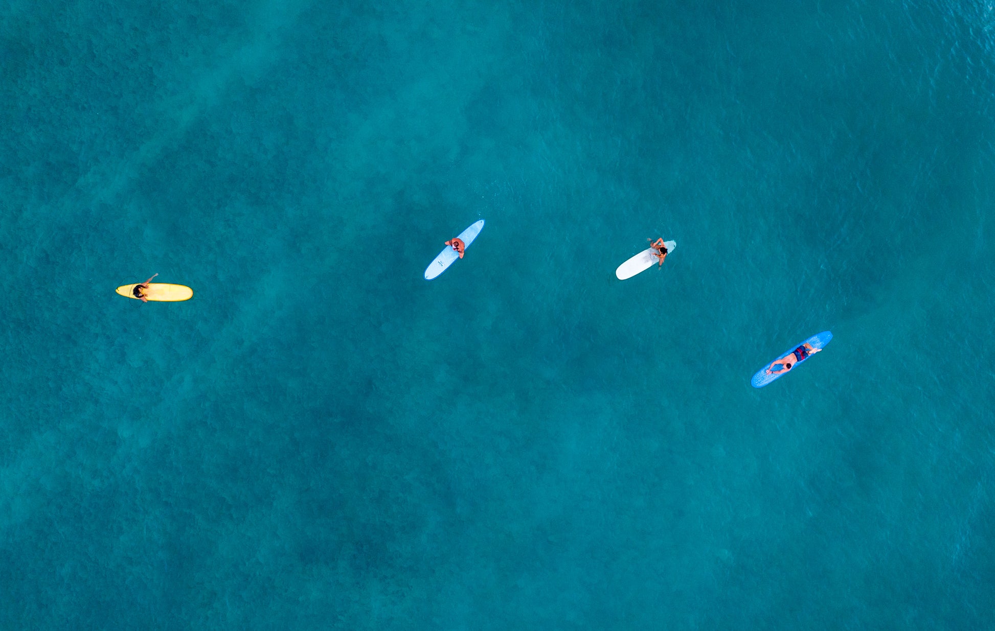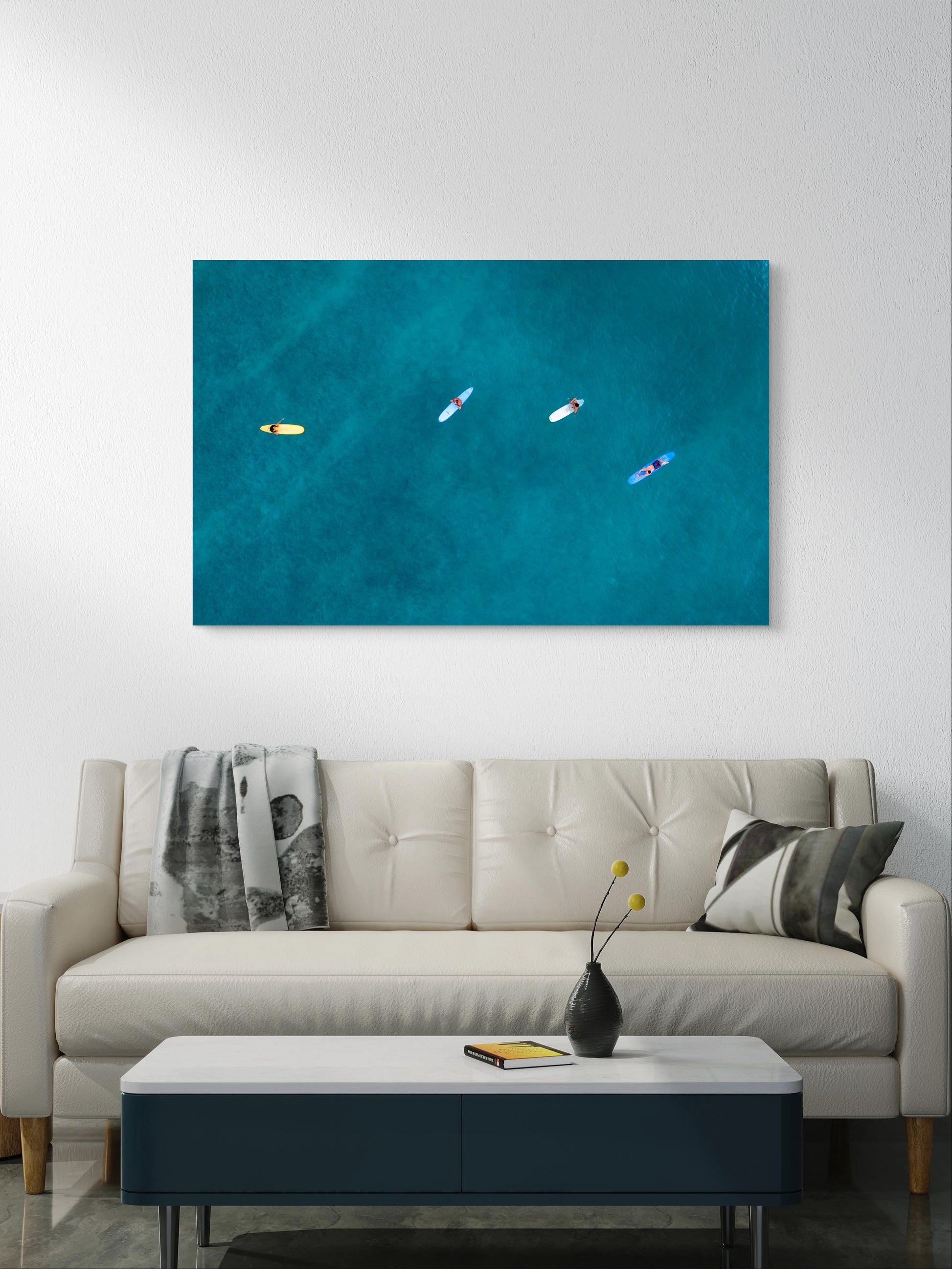 This vibrant aerial image captures a group of surfers peacefully drifting on the serene, crystal-clear waters off the coast of Oahu. The contrasting colors of the surfboards—a bright yellow, white, and shades of blue—stand out against the deep turquoise sea, creating a visually striking composition that emphasizes the tranquility of the ocean. Each surfer floats patiently, waiting for the next wave, evoking a sense of anticipation and connection to the rhythm of the sea. Perfect for home or office decor, this photograph brings a touch of island calm and the laid-back surfing culture of Oahu indoors. It’s an ideal choice for those who love ocean scenes and the quiet, reflective moments between the waves.
