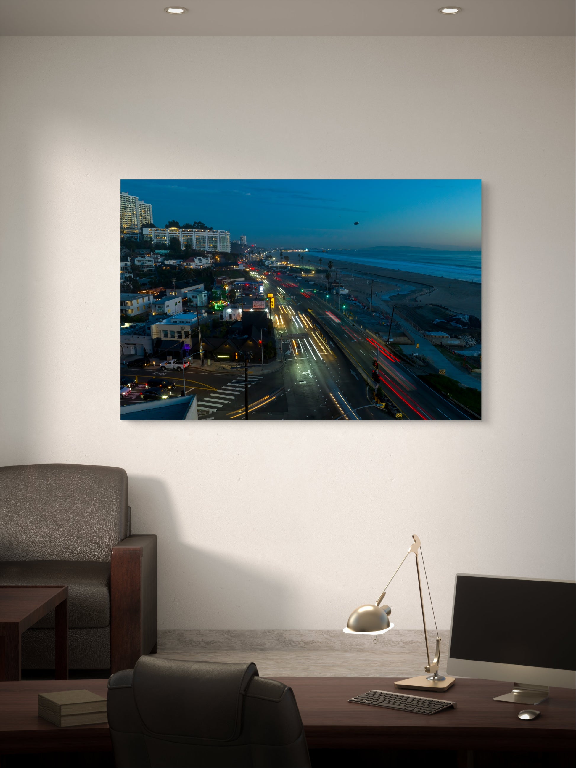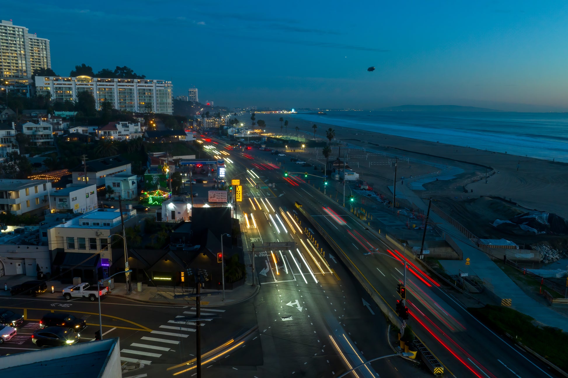 This vibrant capture of the Pacific Coast Highway at Pacific Palisades embodies the dynamic interplay of urban life and coastal serenity. Streams of car lights dance along the roadway, creating an electric contrast to the tranquil expanse of ocean and the quiet sky above. The iconic Goodyear Blimp floats gracefully overhead, adding a nostalgic touch to the scene.