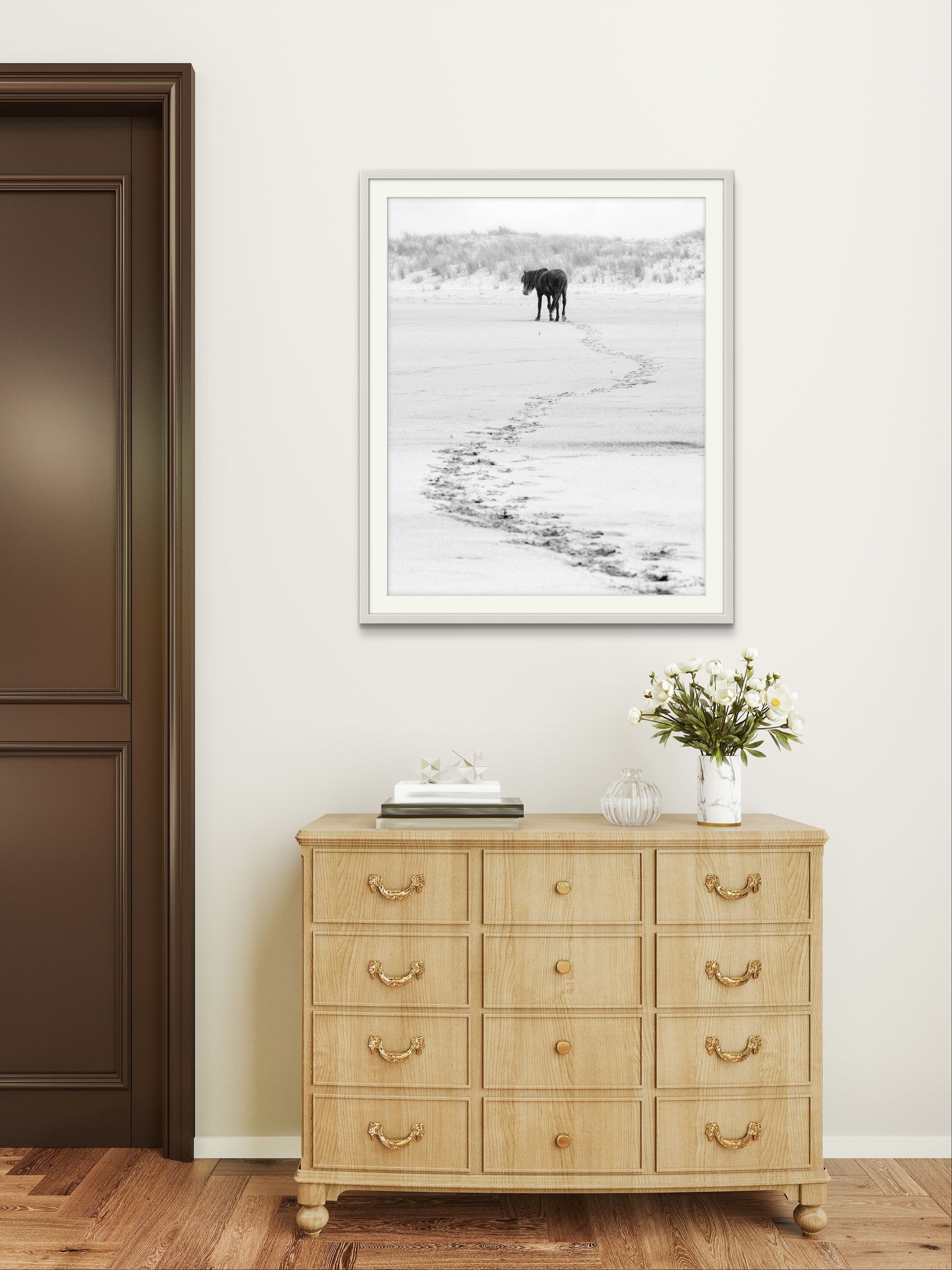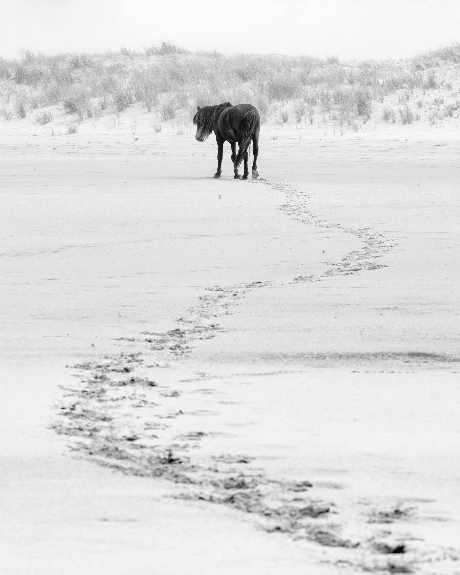 A solitary Sable Island horse stands against a stark landscape, with a single winding trail of hoofprints leading back through the sand. The minimalist composition captures a sense of quiet solitude, as the horse gazes into the distance, leaving behind only traces of its journey across the empty expanse. The softness of the grasses in the background contrasts with the defined, meandering path, evoking themes of freedom, resilience, and the passage of time.