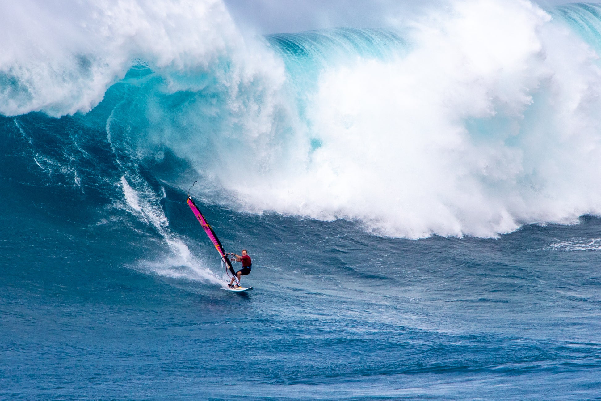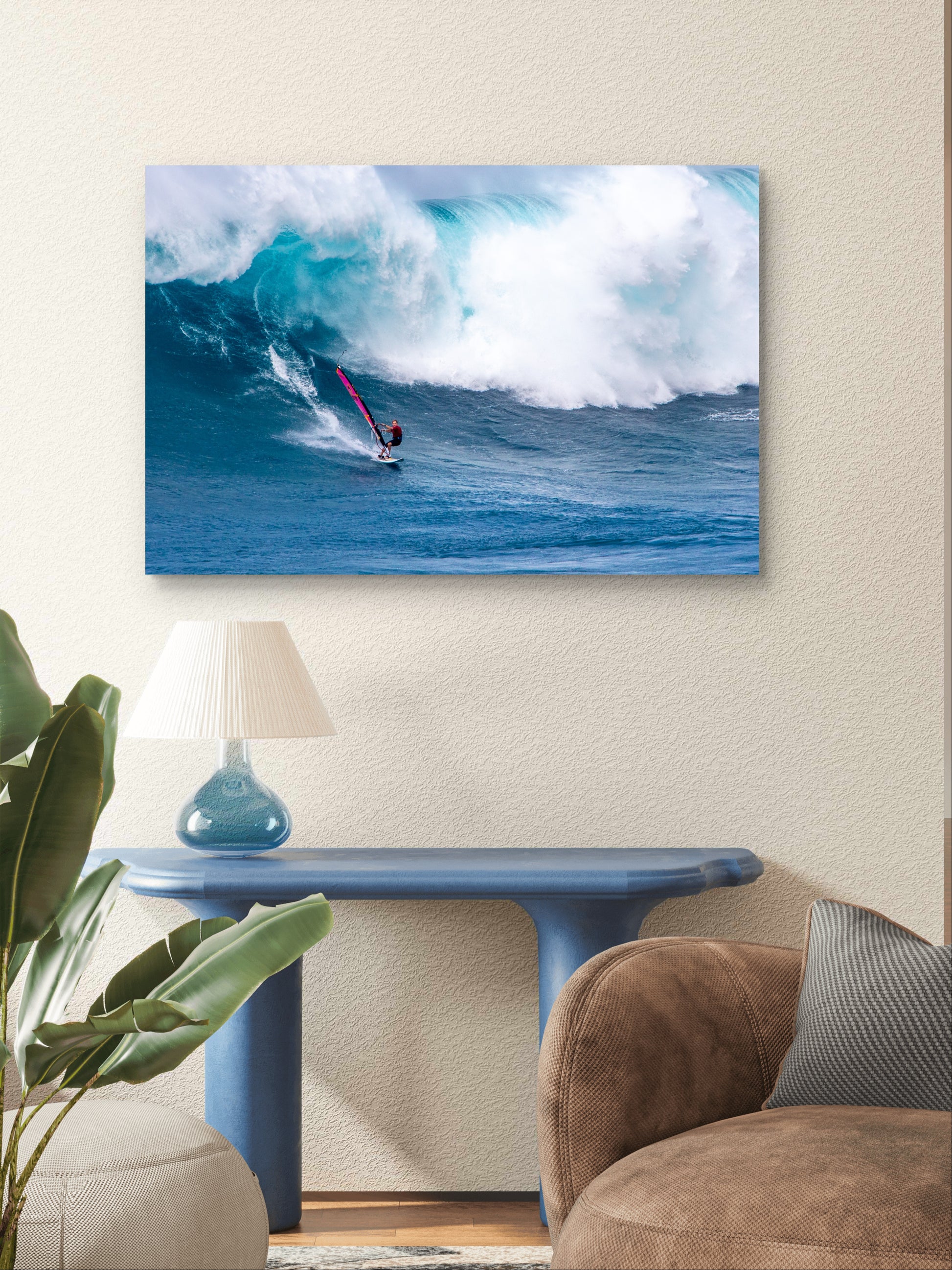 This dynamic photograph captures a fearless windsurfer navigating the towering waves off Maui's coast. The powerful motion of the sea contrasts with the vibrant pink sail, creating a stunning visual centerpiece that showcases both the intensity of the ocean and the courage it takes to ride it. Perfect for home or office settings, this image adds a touch of excitement and drama, evoking the raw beauty of nature. It serves as a captivating statement piece that invites viewers to feel the adrenaline and allure of Hawaii's famous surf scene, making it ideal for spaces that seek to inspire adventure and energy.