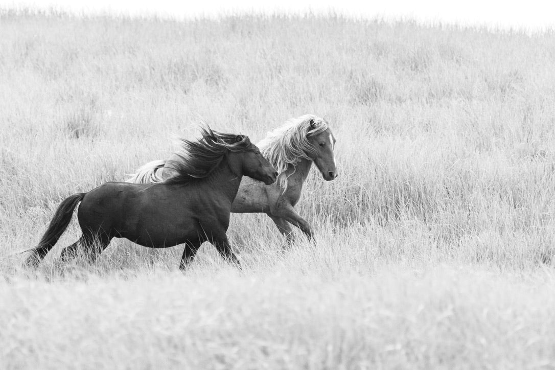 In this powerful scene, two Sable Island horses gallop across a field of soft grasses, their movements synchronized in a graceful duet. Their flowing manes catch the wind, mirroring the wild freedom that defines life on this remote island. The darker horse exudes strength, while its lighter companion adds a gentle contrast, symbolizing the delicate balance of unity and independence in the natural world. This image encapsulates the raw beauty and boundless spirit of these wild horses, making it an evocative addition to any space, from a peaceful home sanctuary to a thoughtfully designed office setting.
