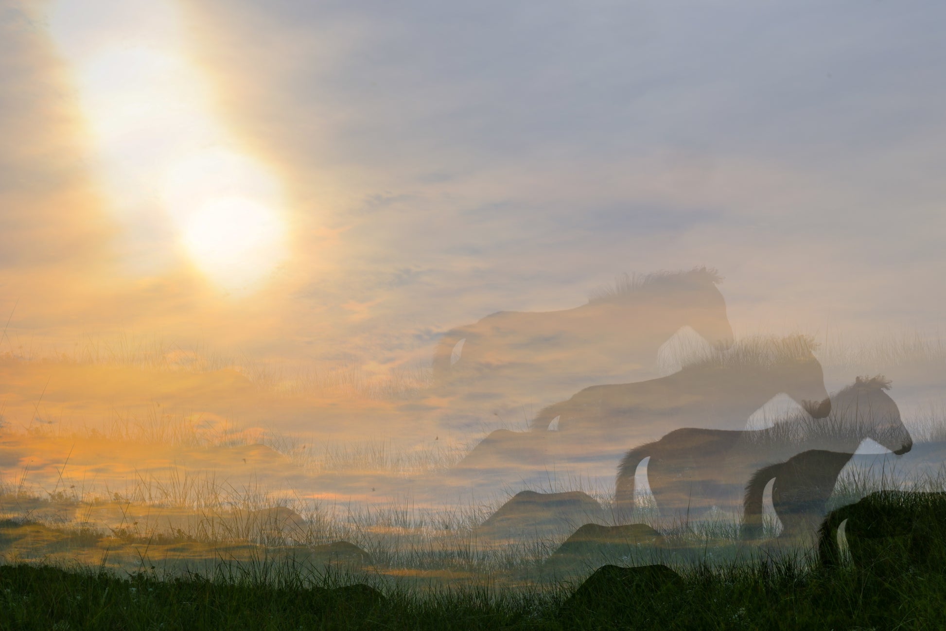 From the Ghosts of Sable Island Series, this image blends the herd with the first light of day, their silhouettes dissolving into the glow of the sky. The horses appear almost weightless, caught between earth and sky, a vision of freedom suspended in dawn’s haze.