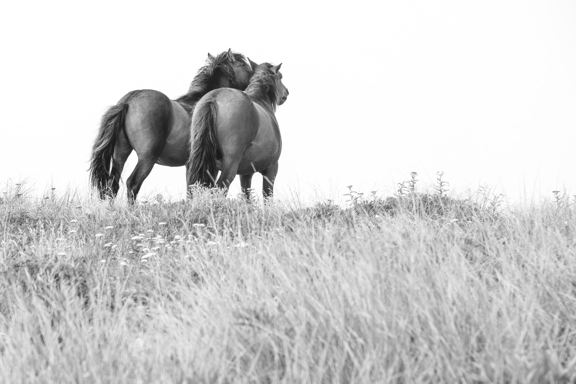 Two Sable Island horses stand closely together on a gentle rise, their bodies pressed in an affectionate gesture of unity. The soft, monochromatic tones of the image bring out the quiet strength of their bond, set against a backdrop of wild grasses and open skies. This moment captures a rare, intimate connection in the vastness of their natural habitat, symbolizing resilience, companionship, and the spirit of the wild.