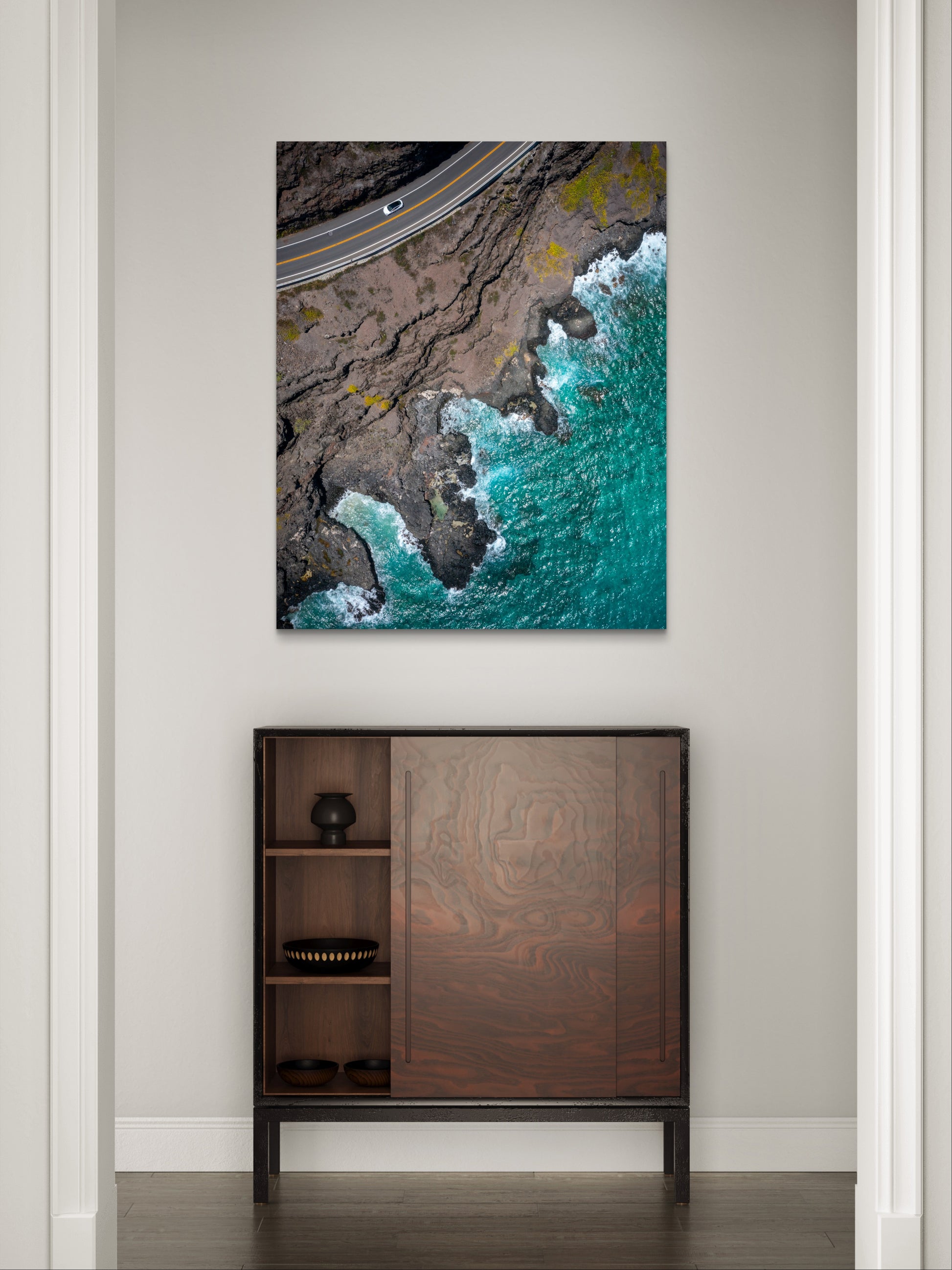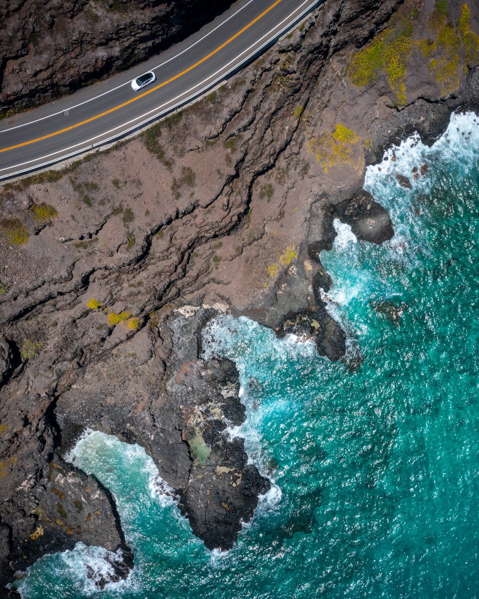 This aerial photograph showcases the rugged beauty of Oahu's coastline, where a sleek highway curves gracefully along dramatic cliffs. The ocean below crashes into the rocky shore, sending frothy white sprays across deep turquoise waters. The interplay between the smooth, winding road above and the jagged volcanic rocks below highlights Oahu's natural contrasts—where human engineering meets the raw power of the Pacific. A striking composition that captures the essence of island adventure, this image invites viewers to imagine the thrill of driving along one of Hawaii's most breathtaking coastal roads.