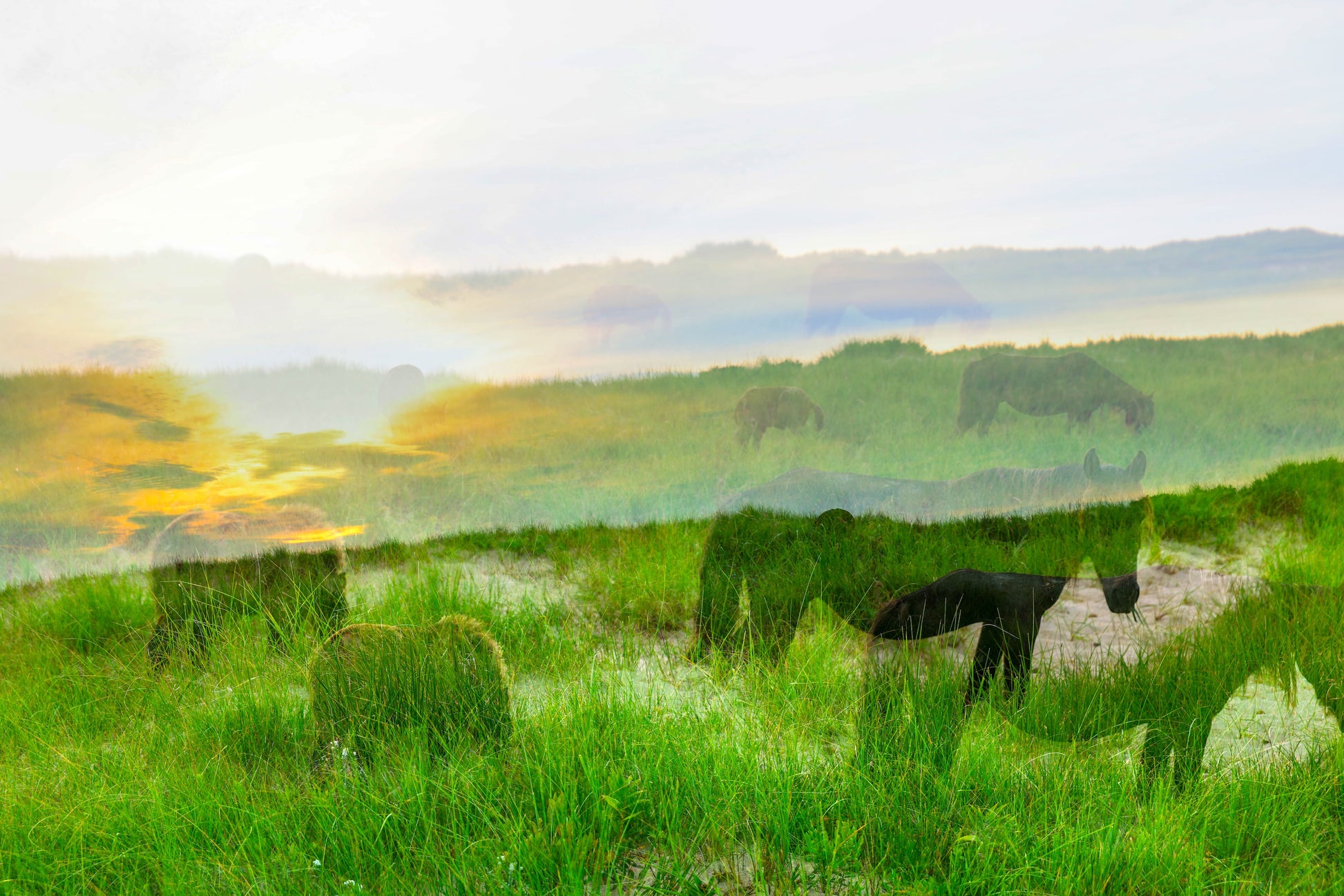The horses appear as silhouettes dissolving into the horizon, softened by the glow of sunrise. As part of the Ghosts of Sable Island Series, it reflects the fleeting presence of the herd, always moving, always beyond reach.