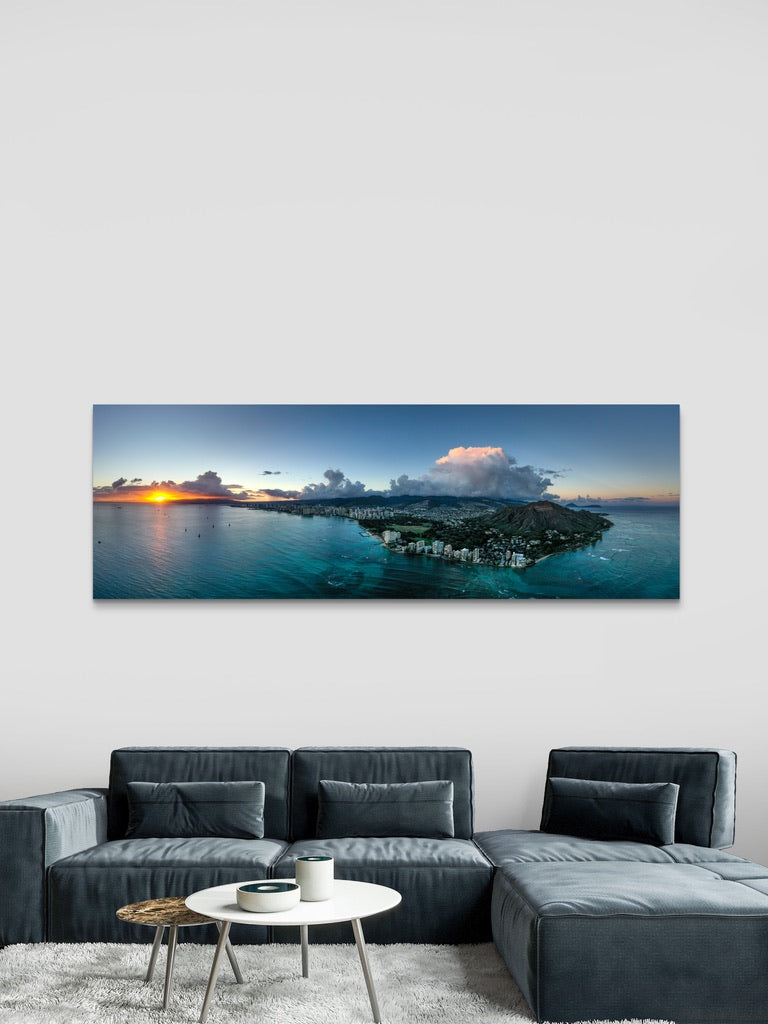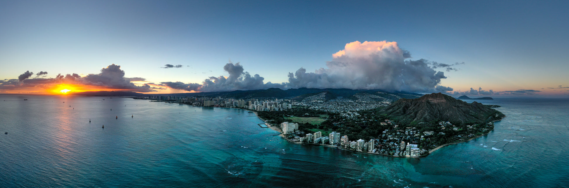 In this breathtaking aerial photograph, Oahu's coastline comes to life as the sun gracefully sets. Translucent blue waters stretch out, while the vibrant city of Honolulu and the iconic Diamond Head crater bask in the fading light, creating a captivating scene that blends nature and urban beauty.