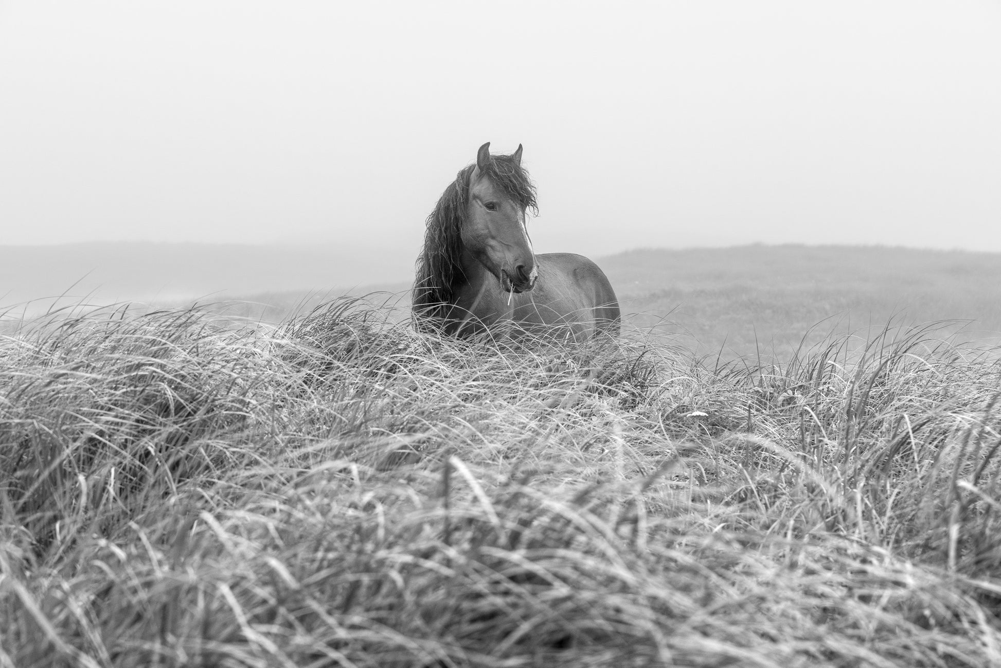 Emerging through mist and tall grasses, a lone Sable Island horse stands with quiet strength, its gaze calm yet piercing. The soft monochromatic tones accentuate the foggy landscape, enveloping the horse in a timeless, ethereal aura. This scene captures the mysterious beauty of Sable Island, where wild horses roam freely, unbothered by the world beyond. The textured grasses in the foreground add a sense of depth and immersion, drawing viewers into the wild serenity of this isolated place.